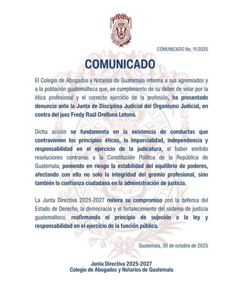 En un comunicado oficial, el CANG confirmó que presentó una denuncia ante la Junta de Disciplina Judicial del Organismo Judicial, señalando que las acciones del juez contravienen la Constitución y ponen en riesgo la institucionalidad del país.