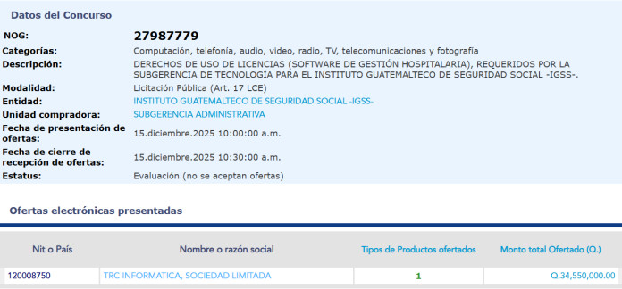 El primer intento del IGSS fue en septiembre de 2024, cuando TRC ofreció el servicio por Q7.99 millones. Aunque se adjudicó, el proceso quedó sin efecto por no cumplir con los requisitos de adquisición con proveedor único.