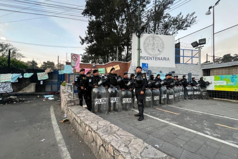 Estudiantes mantienen cierre en el campus central mientras agentes policiales y el MP vigilan el área.